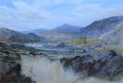 An extensive river landscape with waterfall