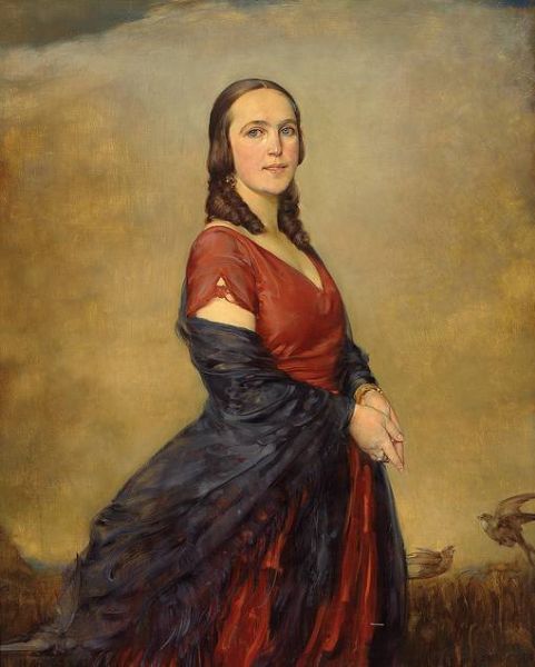 Die Frau des Künstlers im roten Kleid mit blauer Stola vor Landschaftshintergrund