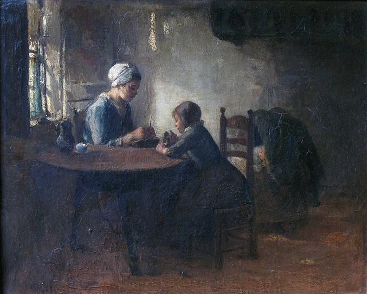 Aardappelschillende moeder en spelend kind bij de wieg.
