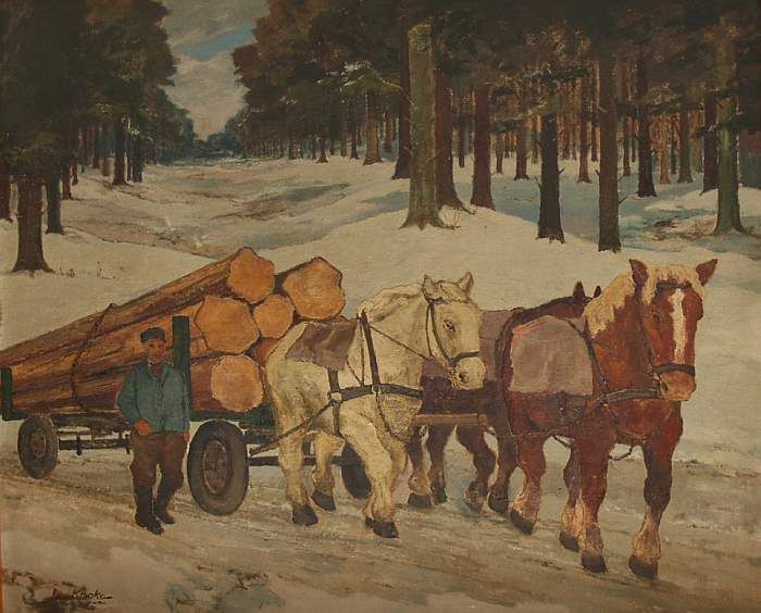 Bauer mit Pferdegespann beim Abtransport der Baumstämme in winterlicher Waldlichtung