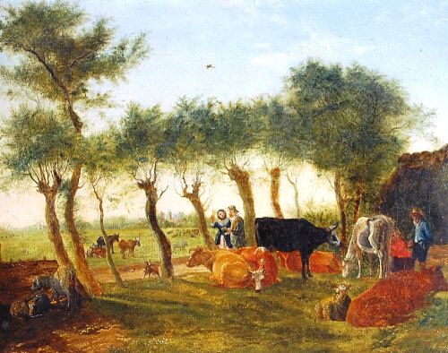 Figures, livestock and pollarded willows in a landscape