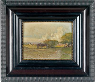 Pferdekutsche auf einem Feldweg und Landschaft mit Heuwagen
