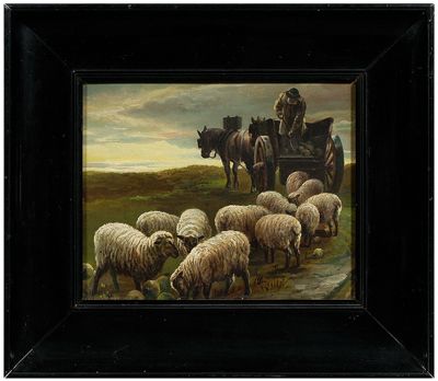 | shepherd feeding sheep from back of horse-drawn wagon | |