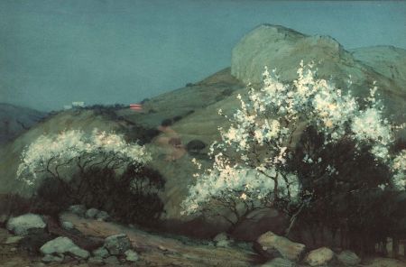 | Moonlit Continental Landscape with Blossom Trees in Foreground and Hills Beyond | |