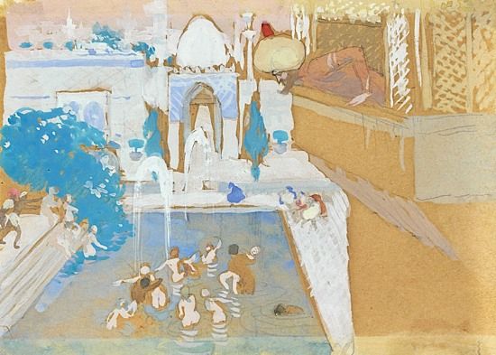 | Scène de harem : un pacha regardant les femmes au bain | |