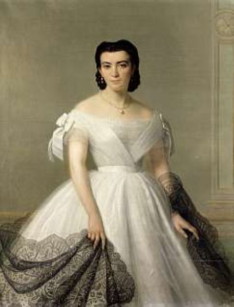 | Porträt einer jungen Frau in weisserc Robe mit schwarzem Spitzenschal | |