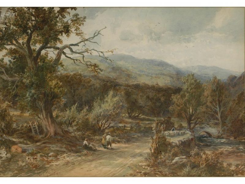 FIGURES WITH SHEEP ON A COUNTRY ROAD (IN NORTH WALES