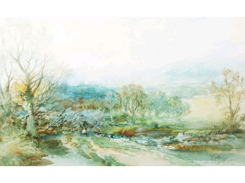 Rural river scene with fisherman sat on the bank