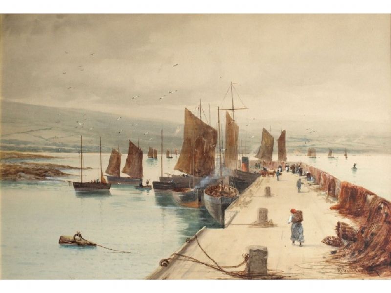 | Fishermen drying nets on a harbour wall, trawlers in a bay beyond | |