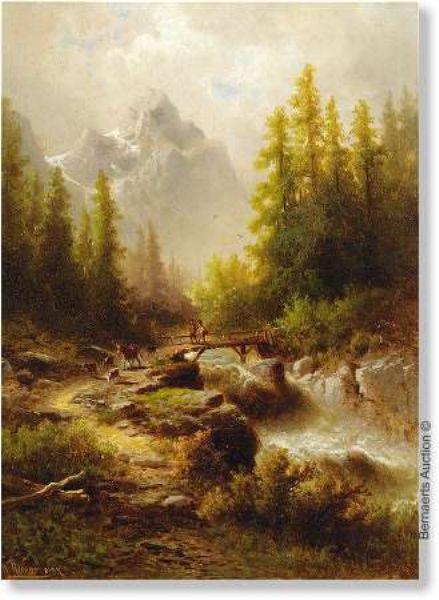 Wooded landscape with shepherds near a bridge and mountain in the background.