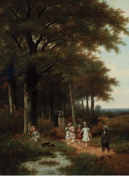 Children Playing Along a Forest Path