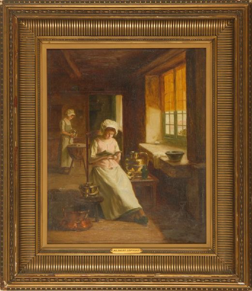 | Interior scene. Depicting a young woman reading by a window while another woman polishes silver in the background. | |