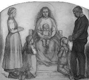 Bauernfamilie in Anbetung der Muttergottes mit Kind