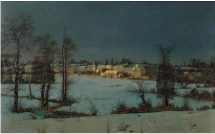 Village sous la neige aux aurores