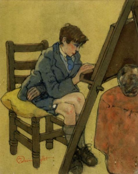 a boy seated painting at an easel