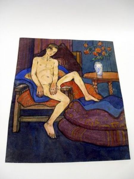 Hude study, boy seated in an armchair beside a table with a vase of flowers