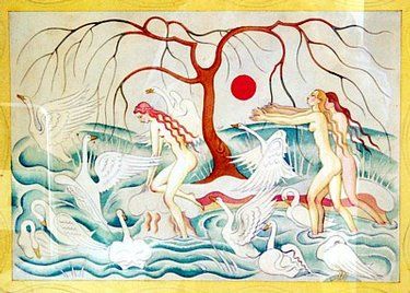 Young naked women and swans before a tree and setting sun, possibly Leda and the Swan
