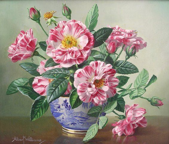 Study of bi-colour roses in a willow pattern jardiniere