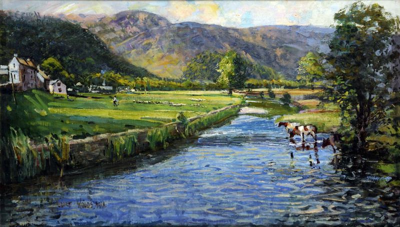 | Modern British school, mountainous wooded river landscape with buildings | |
