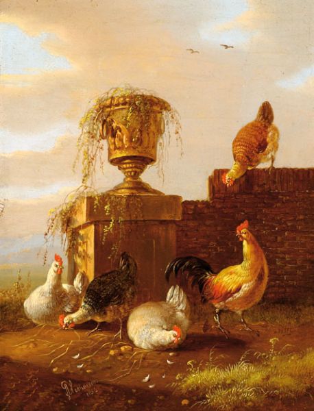 | Two cocks and three chickens by a wall and a pillar with a classical vase in a landscape | |