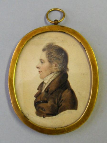 | A Portrait Miniature of a Gentleman, quarter-length turned to the left in profile, wearing a brown coat | |