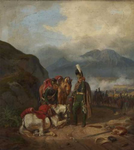 Zwei bayerische Chevaulegers bei einem verletzten Schimmel