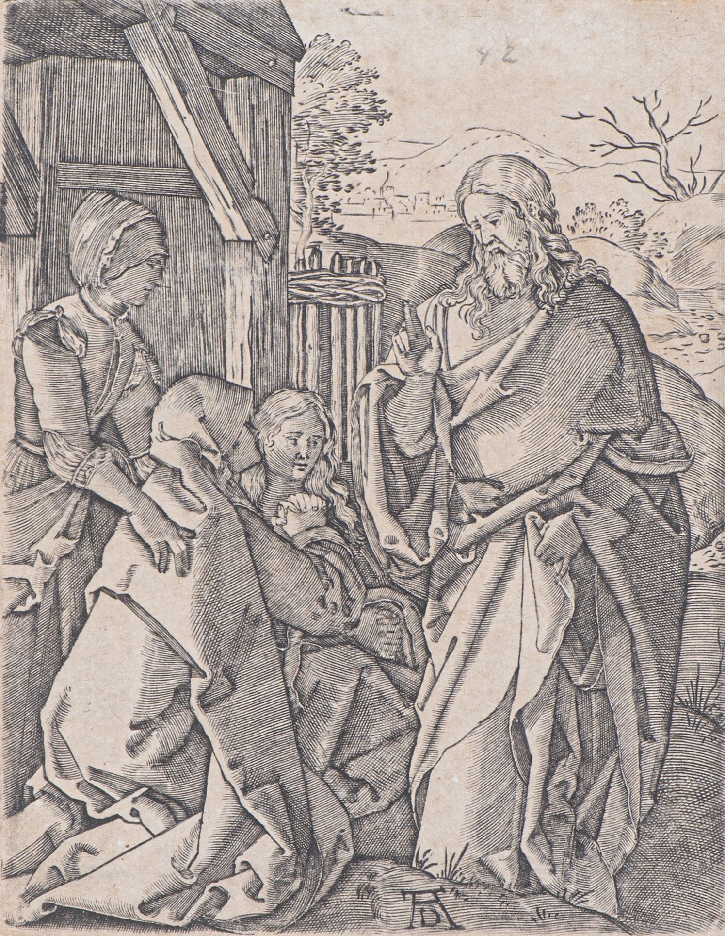 Albrecht Dürer (1471 - 1528), "Christ taking leave of his mother" around 1509, late print. Xylography inspired by "The little passion", monogram bottom in the middle, stamp on the back of the paper "Doublette dar Kunsthalle Bremen" and referenced in | |