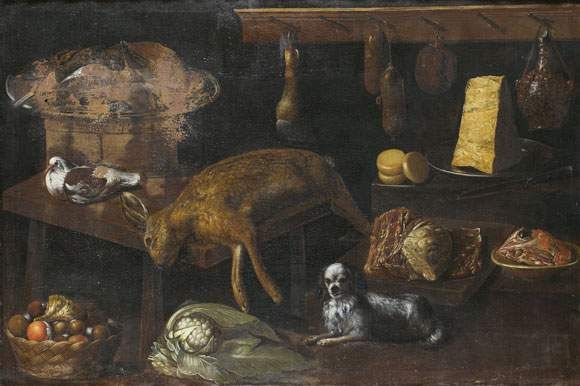 | Nature morte au gibier, à la corbeille de fruits, aux fromages gardée par un chien | |