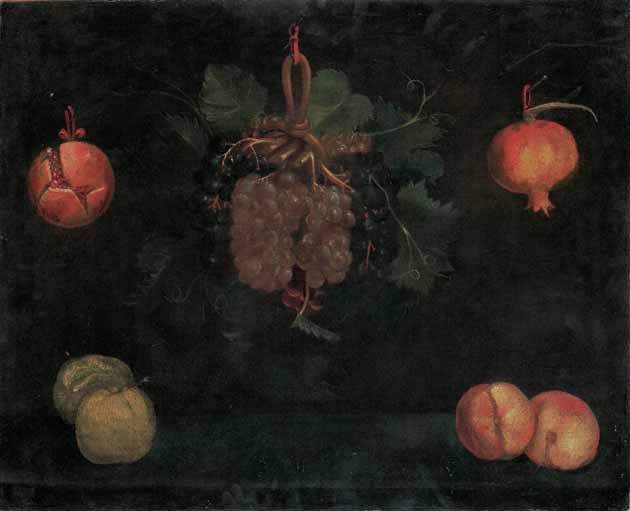 | Natura morta con grappolo d’uva, cipolla, melagrana, pesche e mele | |