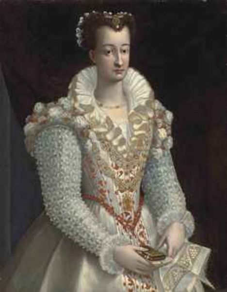 | Portrait of a lady, half-length, in an embroidered white dress, a jewelled pendant with the Annunciation, holding a book in her | |