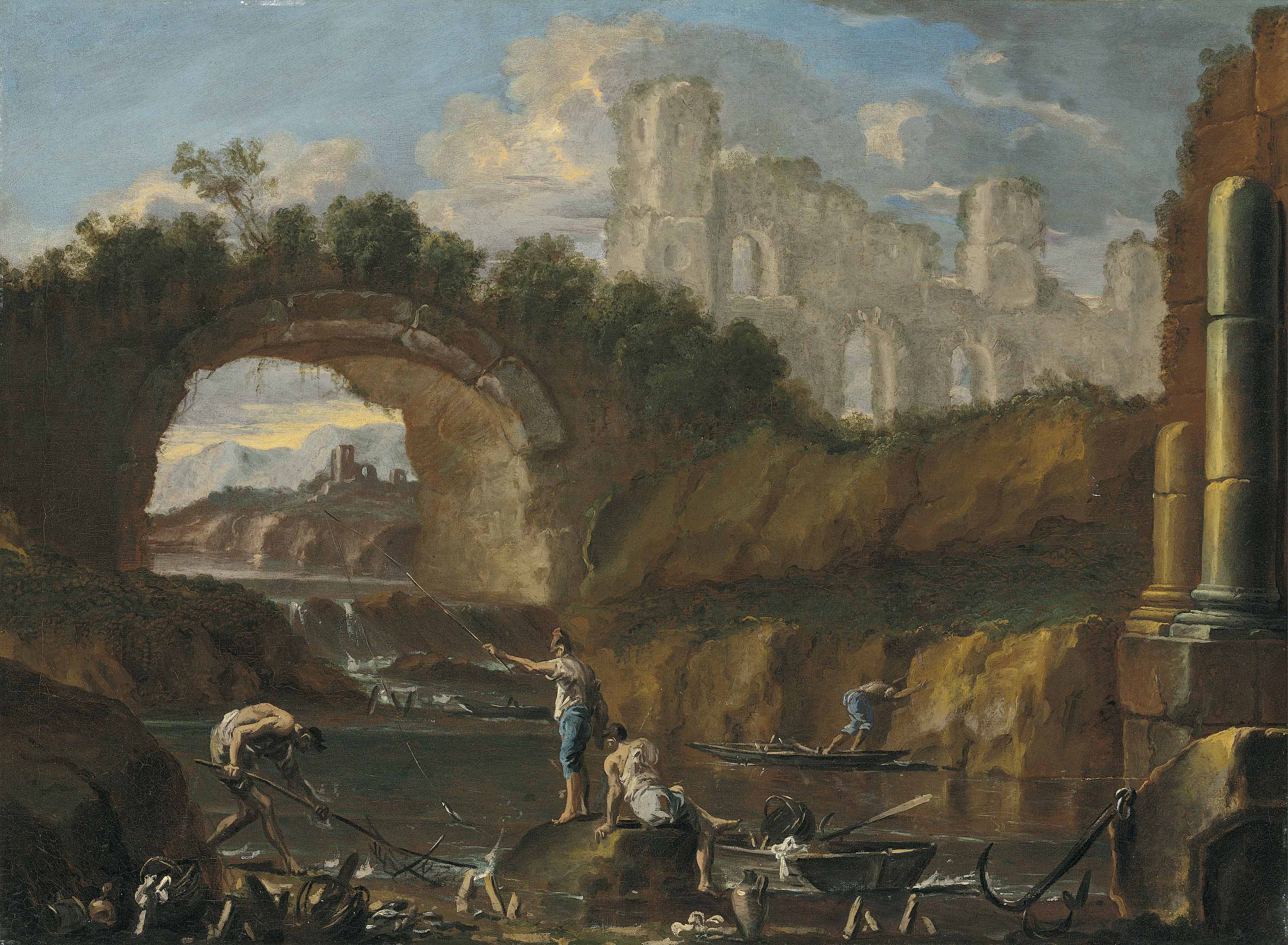 | A river landscape with fishermen among ruins | |