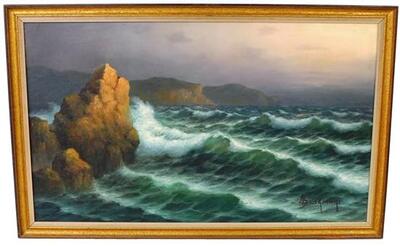 | depicting marine scene with rough waves crashing on rocky promontory, purple yellow sky | |