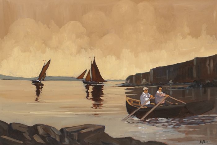 TWO MEN ROWING A CURRACH AT THE CLIFFS OF MOHER