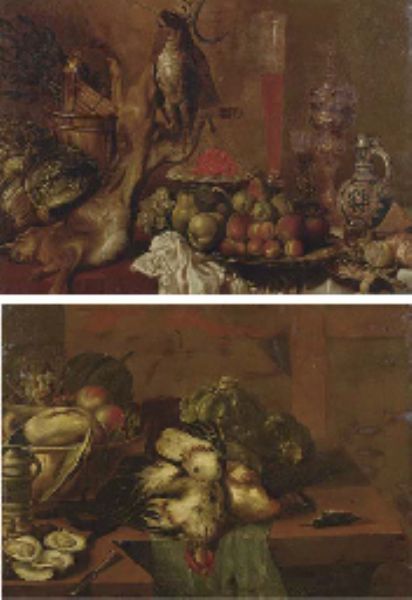 | Vegetables, a hare, a pheasant, fruit, and glass and silverware on a draped table; and Oysters, a beer jug, a copper bowl with | |