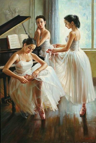 Three ballet girls by a piano.