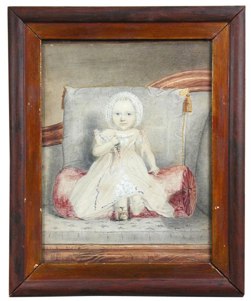 | Portrait of a small child holding a coral and silver rattle, and seated on a pink cushion | |