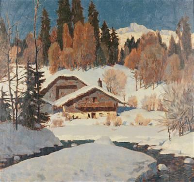 Almhaus in verschneiter Landschaft