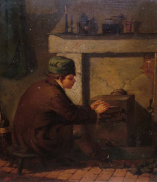 Portrait of a boy warming his hands by a fireplace