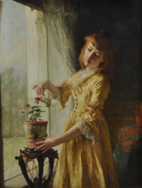 A lady watering a plant on a pedastel