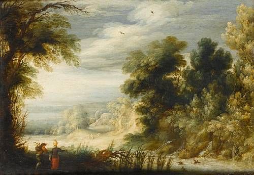 | A wooded river landscape with a peasant couple collecting wild produce and water beside a waterfall | |