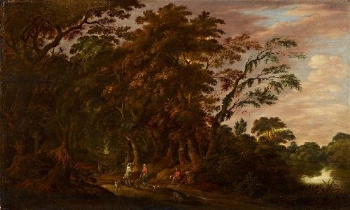 | WODDED LANDSCAPE WITH PEASANTS AND HUNTSMEN | |