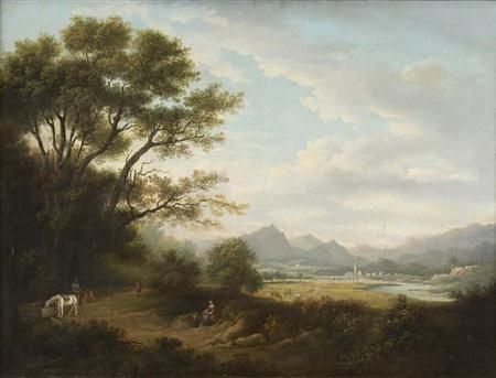 A WOODED LANDSCAPE WITH RESTING FIGURES AND DISTANT TOWN