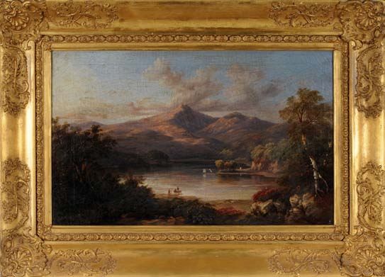 | A highland loch scene, figures and boat on a shore in the foreground, a mountain beyond | |