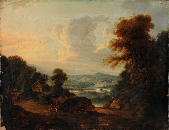| An extensive upland river landscape, travellers on a path in the foreground | |
