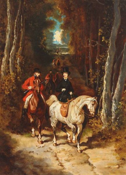 | Elegante Dame im schwarzen Reitkleid auf Schimmel und zahlreiche Reiter auf malerischer Allee | |