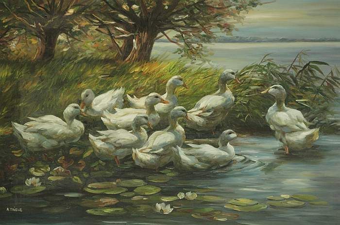 Entengruppe am bewaldeten, mit Schilfgras bewachsenem Seeufer tummelnd