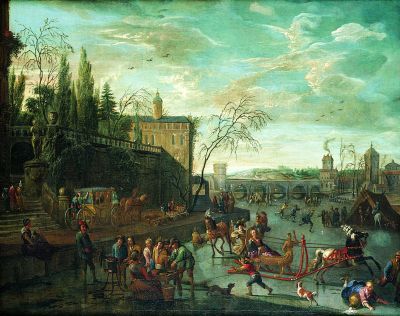 | Patineurs sur une rivière gelée sous la terrasse d'un palais classique | |