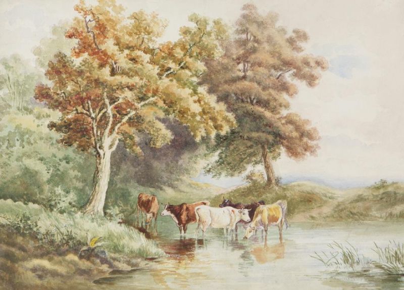| CATTLE WATERING IN THE NEW FOREST under the shade of an oak tree | |