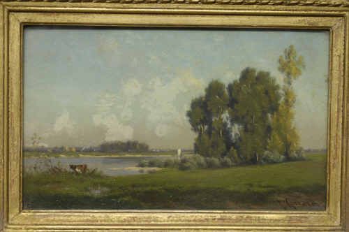 | Summer River Landscape with Cattle in the foreground, boat on a river beside trees | |