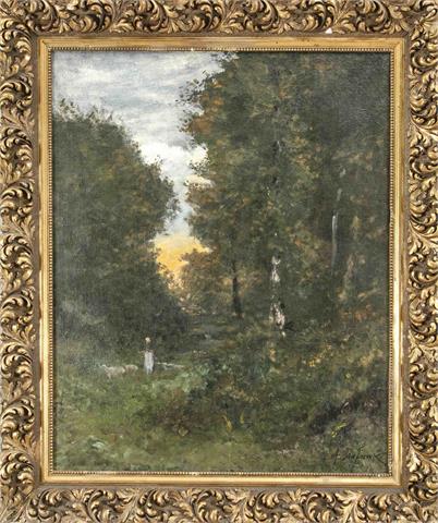 | frz. Maler der Schule von Barbizon, studierte bei Camille Corot, impressionistisches Waldstück mit Schafhirin am Abend | |